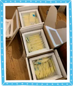 Paolo and I felt that same sticker shock at first, but this was the only convenient and reliable option. Sara simply called FedEx when a box was ready, and they billed our account. We could have gone the DIY route, but she would have had to place Styrofoam containers in cardboard boxes, pad them with dry ice or gel packs, insulate them with newspaper, and seal the boxes tight. It would have been way more effort and still required overnight delivery, plus we wouldn’t have known if the boxes had stayed cold enough in transit. Fluctuating temperatures cause spoilage, and when it’s milk for your newborn, you do cry over it.